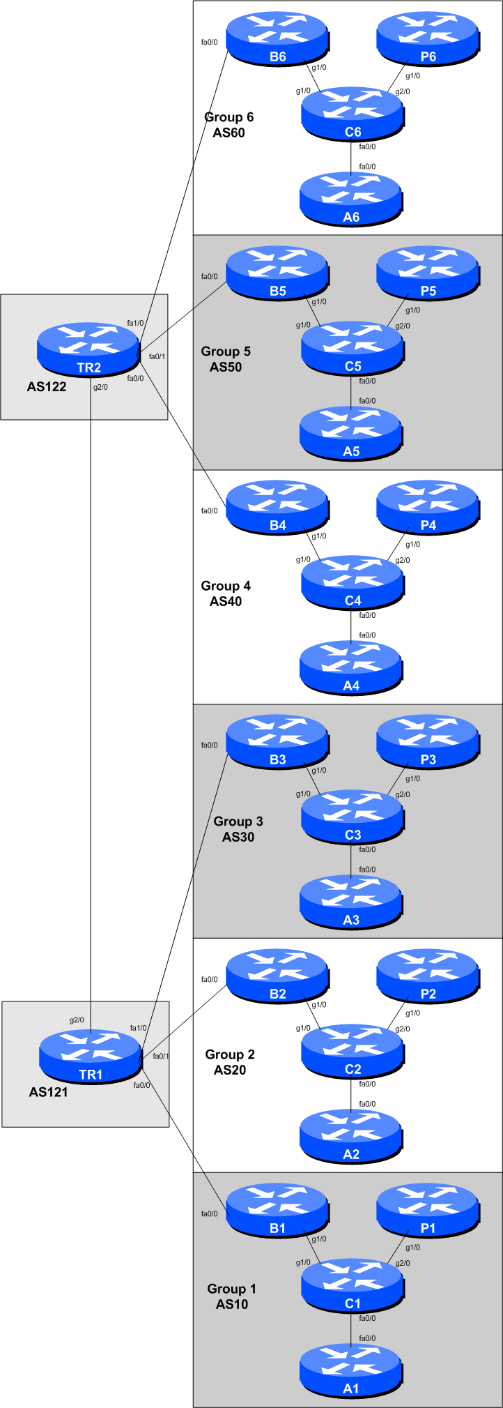 The following configuration examples show the suggested/recommended configuration to be implemented on the routers in each group. Replace the RX in the examples with the router type (either B for Border or C for Core or P for Peering or A for Access) and Group number as appropriate.