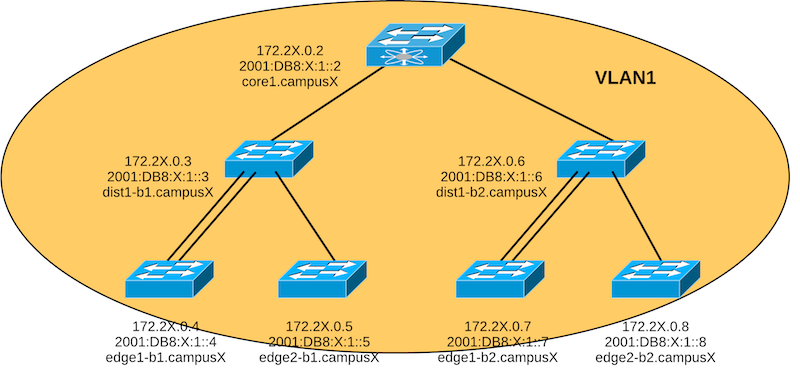 Now that we have done the initial configuration of all the switches in our campus, we can now configure the Management IP addresses (in IPv4 and IPv6). The following diagram shows the flat network we have just built.