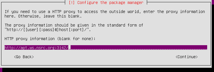 For HTTP proxy please enter http://apt.ws.nsrc.org:3142/ unless the instructors tell you otherwise. This will speed up the installation by using a local cache of packages.