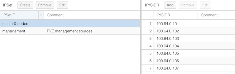 Go to Datacenter, Firewall > IPSet