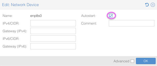 Select “Autostart” and save. (Do not set any IP address; this interface is only for carrying traffic to and from the outside world, from the bridge you’re just about to create)