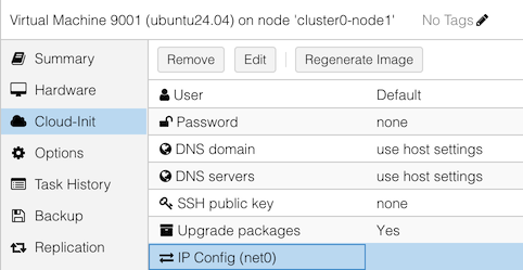Click on your newly-created VM in the left-column (make sure template 9001 is NOT selected!) Then click on Cloud-Init in the second column (underneath “Hardware”).