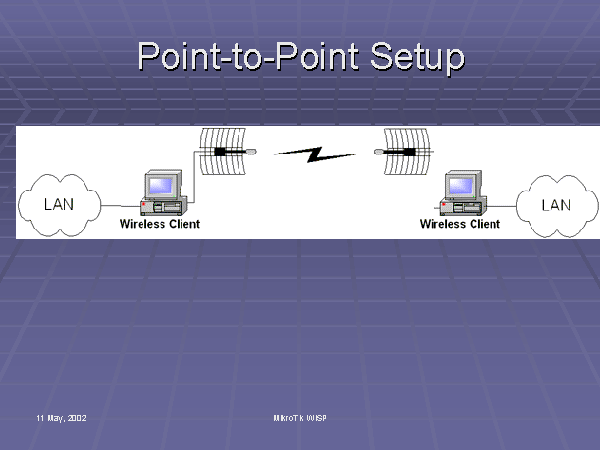 You can connect two Local Area Networks using two MikroTik routers and point-to-point link. So there will be 11 Mb/s channel between two LANs. This configuration is used in the Backbone Setup. There is a point-to-point link between the ISP and the Base Site.